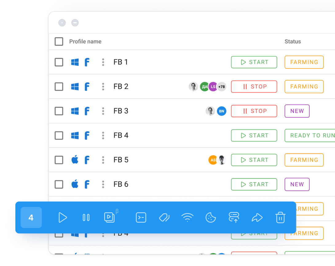 Group by niches, status and any other criteria. Use the layout, icons and color indication to quickly find browser profiles.